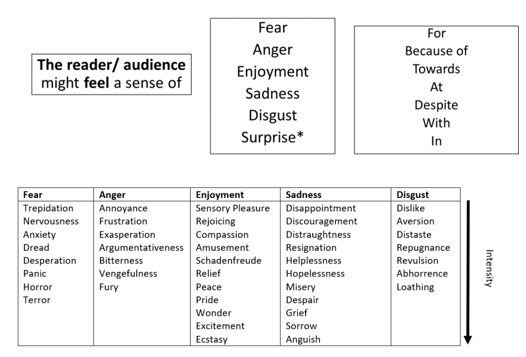 In 2022, several teachers were selected to partake in sessions with academics from Aston University’s English department. Dr Marcello Giovanelli, Dr Chloe Harrison, and Dr Megan Mansworth created an excellent programme where we, as attendees, gained greater insight into certain areas of contemporary stylistics. Three aspects were investigated: Text World Theory, Cognitive Grammar, and Reader Response. The first session of three, focussed on the three academics providing attendees with an overview of the areas. The next two sessions saw attendees collaborate on resources and then feedback about how the theory had been implemented in our different contexts. The final session was thus an opportunity to share some of the amazing resources that other attendees had utilised. The content on all three of the areas was deeply interesting and had an impact on my practice over the last twelve months. Soon after the first session, I developed a resource to aid students in addressing the emotional reaction of readers to fictional texts, with Megan’s input relating to Reader Response providing the stimulus for my ideas. Analysing a reader’s response to a fiction text is an area that often is weak in students’ writing, with responses often falling back on ‘readers feel sympathy’ as catch-all responses. After discovering Paul Ekman’s Atlas of Emotions (https://atlasofemotions.org/), I produced the resource below. Since using this in some of my classes, students have been able to articulate the emotional effect evoked by the text with greater precision. The use of this framework has also enabled students to track the changing emotions of characters throughout an extract, which has then led to conversations about how readers respond to these emotions. Are they similar to the emotions that we feel? Are they different? Does re-reading have an impact?